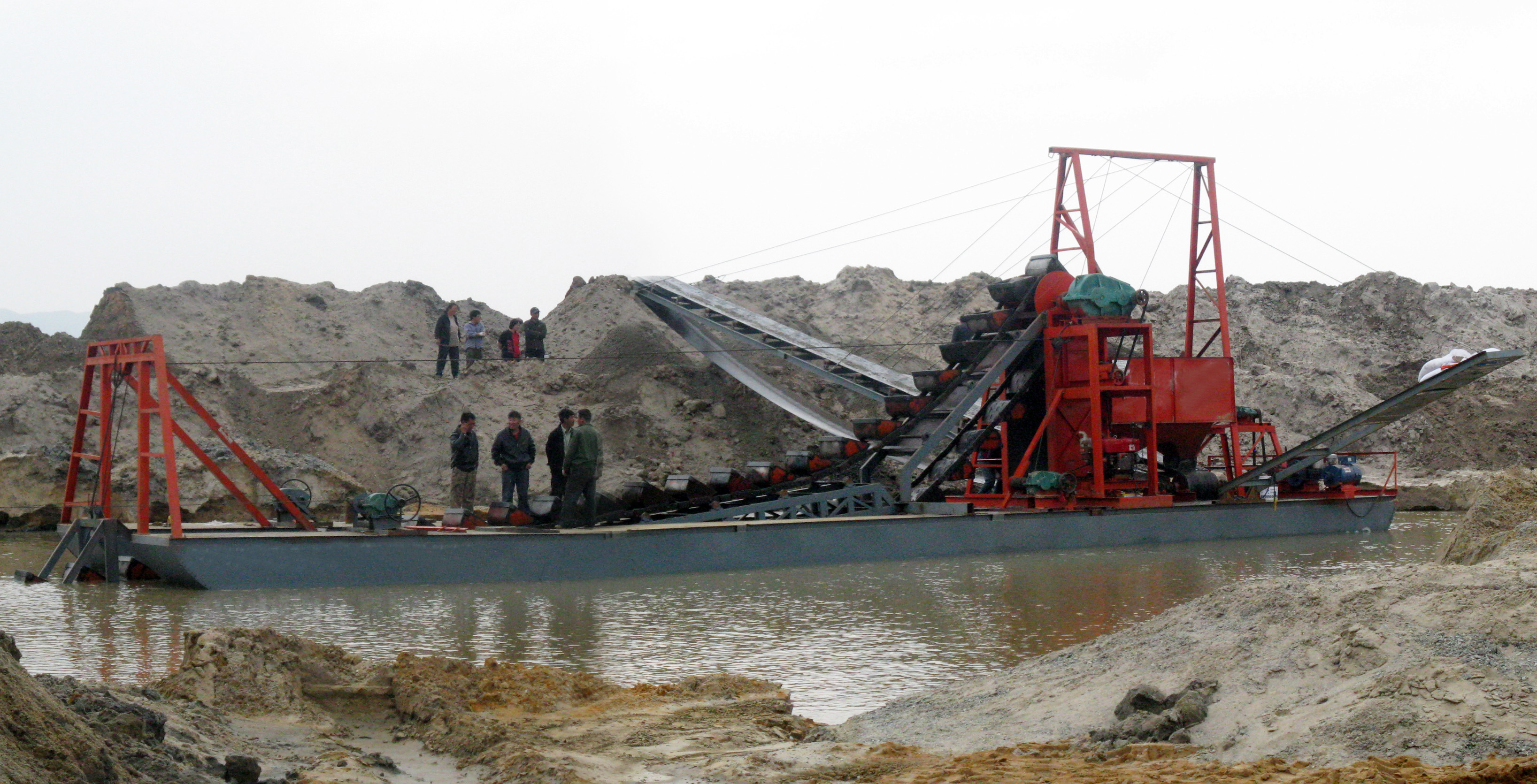鏈斗式挖沙船是一種利用機(jī)械動力對河床底部的泥沙進(jìn)行提取的挖沙設(shè)備,一般情況下多采用流動作業(yè)。挖沙船的浮體采用拼裝式箱型結(jié)構(gòu),挖沙船同時還配有挖掘裝置、篩選裝置、提升裝置、傳送裝置等。挖沙船通過動力裝置驅(qū)動挖斗上料,石塊通過篩選傳由輸送帶傳出,沙子由輸送帶傳到指定地點(diǎn)。大型河道挖沙船的機(jī)械化和自動化程度極高,一條挖沙船即可成為一個生產(chǎn)單位,可以實(shí)行采沙和沙石分離精選全過程。